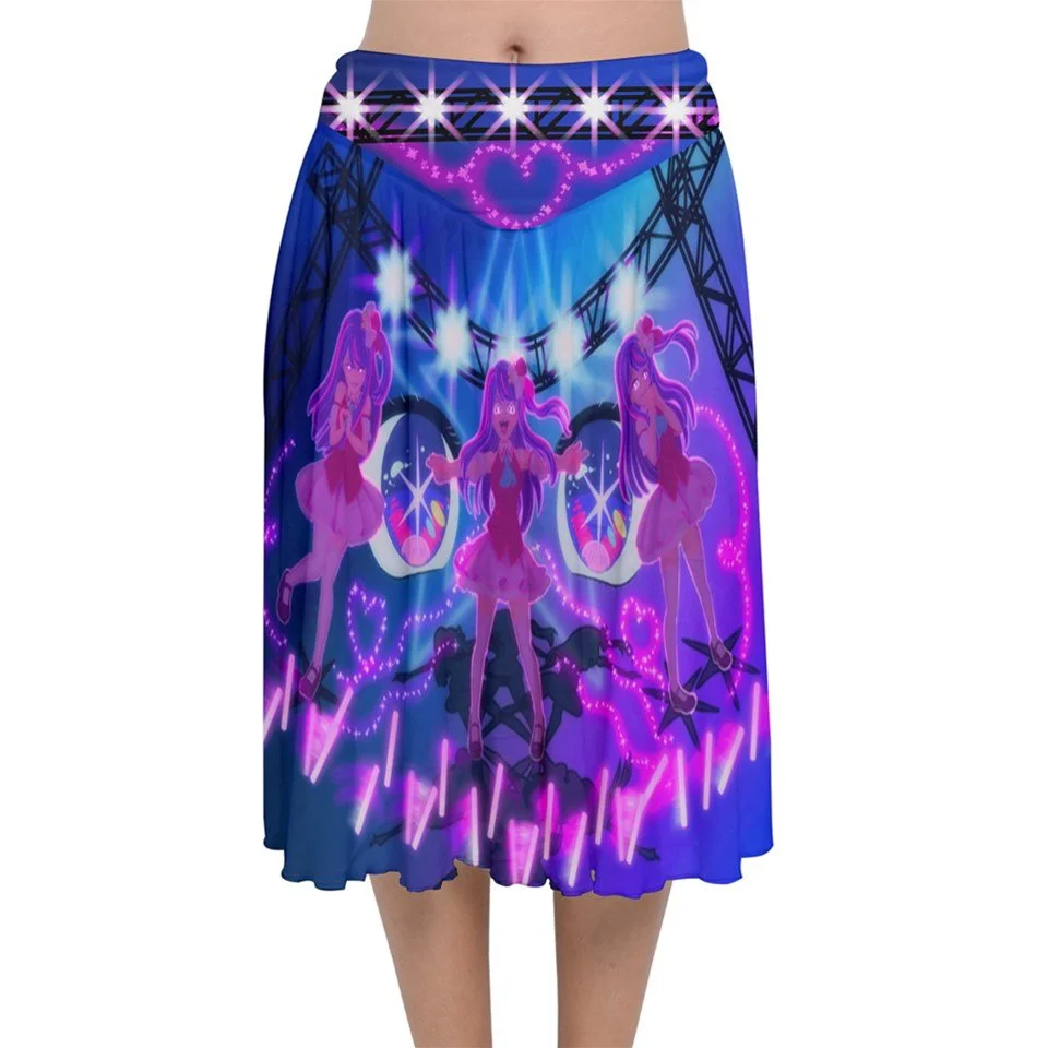 Cutepunk pop color velvet flared midi skirt. Show off your individuality by being the most kawaii rebel around. Great for pastel goth, menhera, jinrai kei, fairy kei, and decora. Coordinates well in Pop and pop gothic wardrobes.